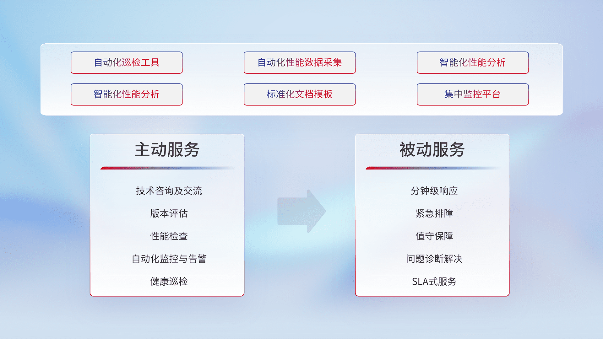 智能化工具和标准化文档,,,,保障服务质量,,提供主动服务(包含技术咨询、、、版本评估、、、、性能检查、、、自动化监控与告警、、健康巡检)和被动服务包含(分钟级响应、、、、紧急排障、、、值守保障、、问题诊断解决、、SLA服务)。。。