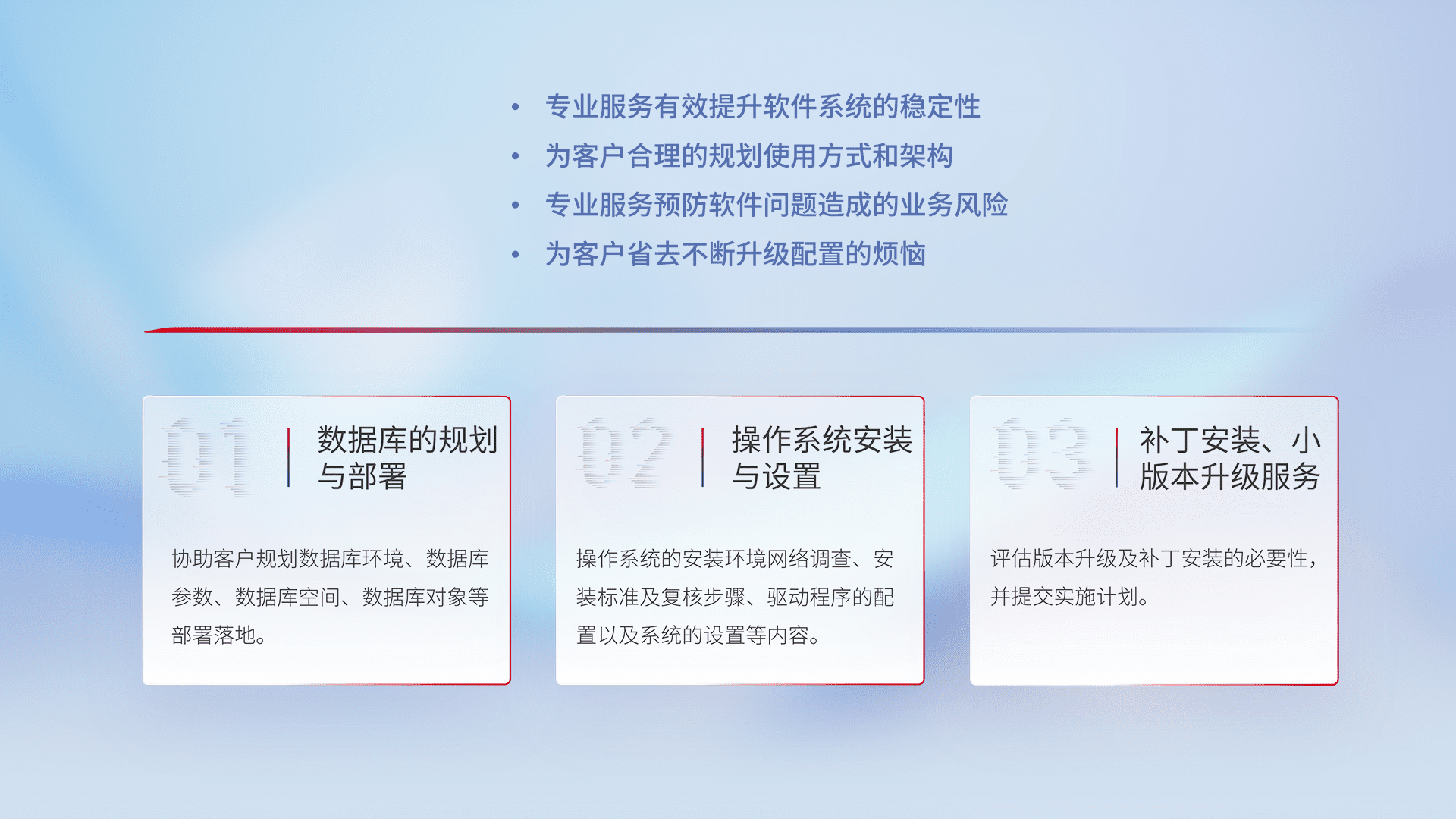 为客户提供软件规模升级、、、、快速部署、、、、按需配置的专业服务,,从数据库的规划与部署到操作系统的安装与设置,,再到补丁安装和小版本升级提供支持。。。。